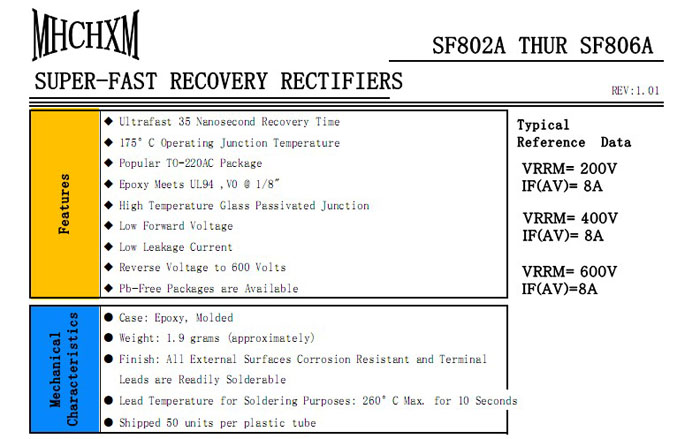 MHCHXM 超快恢复二极管SF802A中文资料,MHCHXM 品牌原装超快恢复二极管SF802A参数,大电流超快恢复SF802A电性资料PDF下载, SF802A超快恢复二极管. 详询400-9929-667