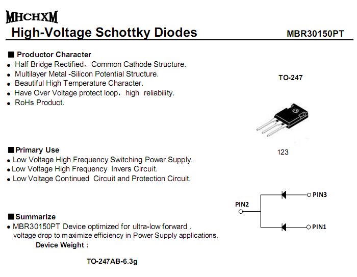 MHCHXM 肖特基二极管MBR30150PT中文资料,MHCHXM 品牌原装超肖特基二极管MBR30150PT参数,大电流肖特基二极管MBR30150PT电性资料PDF下载, MBR30150PT肖特基二极管. 详询400-9929-667