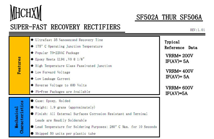 MHCHXM 超快恢复二极管SFF506A中文资料,海矽美品牌原装超快恢复二极管SFF506A参数,小电流超快恢复SFF506A电性资料PDF下载,SFF506A超快恢复二极管参数5A600V. 详询400-9929-667